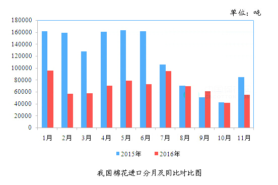 據(jù)中國(guó)海關(guān)總署統(tǒng)計(jì),2016年11月,我國(guó)進(jìn)口棉花5.50萬(wàn)噸,環(huán)比增加1.36萬(wàn)噸,增幅32.99%;同比減少2.95萬(wàn)噸,減幅34.92%;2016年1-11月,我國(guó)累計(jì)進(jìn)口棉花75.12萬(wàn)噸,同比減少53.47萬(wàn)噸,減幅41.58%。2016/2017年度,我國(guó)累計(jì)進(jìn)口棉花15.70萬(wàn)噸,同比減少2.06萬(wàn)噸,減幅11.59%。